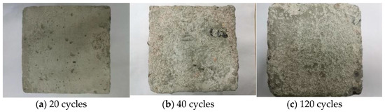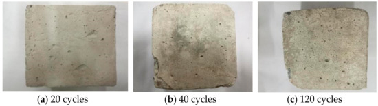 Figure 14 shows the concrete M10F30 in the MgSO4 solution. After 20 cycles, there are more pores on the surface and surface scaling can be seen. After 40 cycles, the cement aggregate peels off on many parts of surface. The internal cement aggregate can be observed by eyes. After 120 cycles, the internal cement mortar structure is damaged seriously. Large blocks fall off both on the cross-section and on the sides.