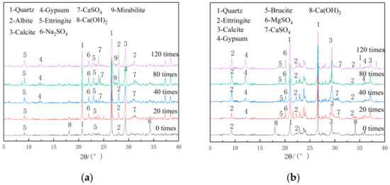 Figure 15b shows the XRD spectrum of admixture concrete eroded by 10% MgSO4 solution, which is quite different from that of Na2SO4. After 20 cycles, the diffraction peaks of brucite, MgSO4, gypsum, and CaSO4 appear and the diffraction peaks of gypsum and CaSO4 are comparatively low at this time because the number of cycles is not large enough. With the increase of cycle number, the diffraction peak of ettringite becomes weaker and those of gypsum and CaSO4 become more intense. That is because most of the Ca(OH)2 in the concrete has been consumed and the pH value declines. The production of CaSO4 is fastened and CaSO4 begins to change into gypsum at that time. After even more cycles, the diffraction peaks of gypsum and brucite become more intense. The ettringite and C-S-H undergo a decalcification reaction and the production of brucite and CaSO4 is fastened. After decalcification, C-S-H changes into M-S-H, which causes the concrete property degradation [49]. After 120 cycles, the diffraction peak of gypsum comes to the top. The concrete expands and cracks and the compressive strength degrades further.