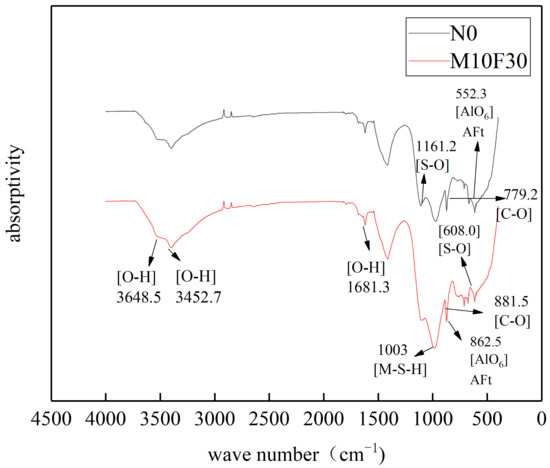 M-S-H needs to be confirmed through FTIR. Figure 16 shows the Fourier infrared spectrum of M10F30 group concrete (with 10% MK and 30% UFA) and reference concrete after experiencing 120 cycles in 10% MgSO4 solution. Three characteristic absorption peaks of O-H can be seen at 3648.5, 3452.7, and 168.81 cm−1 in test samples. These absorption peaks are relatively small, indicating that most calcium hydroxide has been consumed after 120 cycles. The characteristic absorption vibration peaks of C–O can been seen at 881.5 and 779.2 cm−1, which correspond to the erosion products shown in the figure above. The characteristic absorption peaks come from quartz and calcite. There are stretching vibration absorption peaks of S–O at 1161.2 and 608 cm−1 and absorption peaks of AlO6 at 552.3 and 862.5 cm−1, therefore, it can be known that there must be the erosion product of ettringite in the concrete. The pH value in the concrete must have declined after 120 cycles. In this condition, C-S-H reacts with MgSO4 and produces M-S-H. when the pH value in the concrete is comparatively low, there are characteristic absorption peaks of M-S-H at 1000 and 1040 cm−1 [50], and the characteristic absorption peak values show that the M-S-H content in M10F30 concrete is much more than that in the reference concrete.