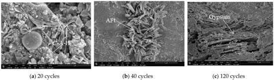 Micro analysis is conducted on the M10F30 concrete by XRD and SEM. Figure 15a shows the XRD spectrum of admixture concrete after erosion of 10% Na2SO4 solution. It shows a significant diffraction peak of Ca(OH)2, and a small diffraction peak of ettringite at the time having no erosion. Since concrete has aggregates, the diffraction peaks of quartz and calcite are also significant. In addition, there is the diffraction peak of albite, which is mainly formed by N-A-S-H losing water at the late stage of hydration [38]. With the erosion by Na2SO4 solution, the diffraction peak of Ca(OH)2 becomes weak while the diffraction peak of ettringite(Aft) gets intensified, because the SO42− ions get in by diffusion and convection, thus reacting with Ca(OH)2 in the concrete and produce ettringite. After some dry-wet alternations, the diffraction peaks of CaSO4 and Na2SO4 can be seen. Moreover, the diffraction peak of CaSO4 gets intensified more and more with the increase of cycles. After 80 cycles, the concrete has some cracks and more Na2SO4 solution gets in, and crystals separate. Now the diffraction peak of Na2SO4 becomes intense and that of mirabilite can been seen. After 120 cycles, the diffraction peak of mirabilite becomes intense. The cracks on the surface of admixture concrete get larger and large blocks of cement mortar and aggregate peel off. The compressive strength degrades significantly.