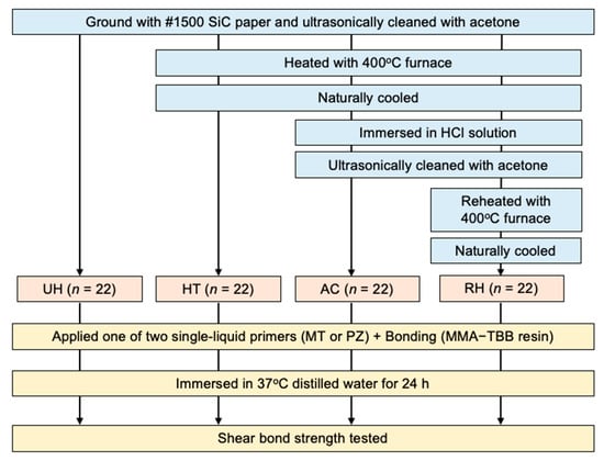 - Hiraba, H.; Koizumi, H.; Kodaira, A.; Nogawa, H.; Yoneyama, T.; Matsumura, H. Influence of Oxidation of Copper on Shear Bond Strength to an Acrylic Resin Using an Organic Sulfur Compound. Materials 2020, 13, 2092. [Google Scholar] [CrossRef]
