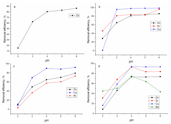 In the Zn/Sr/Cu system, the increase in pH also promoted metal ion removal. The highest zinc and strontium removal were achieved at pH 6.0: 85.8% and 96%, respectively. The sorption of copper ions was favorable at pH 4.0–6.0 when 98% of removal was achieved.