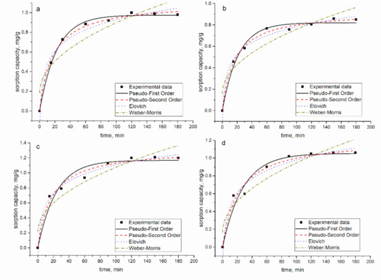 Data obtained experimentally were fitted to four kinetic models: pseudo-first-order model (PFO), pseudo-second-order model (PSO), Elovich model (EM), and Weber and Morris intraparticle diffusion model (IPM). The description of the models can be found in References [13,19].