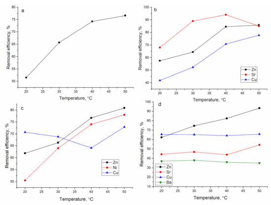 Effect of temperature on metal removal by mineral-organic sorbent (a) Zn, (b) Zn/Sr/Cu, (c) Zn/Ni/Cu, and (d) Zn/Sr/Cu/Ba systems.