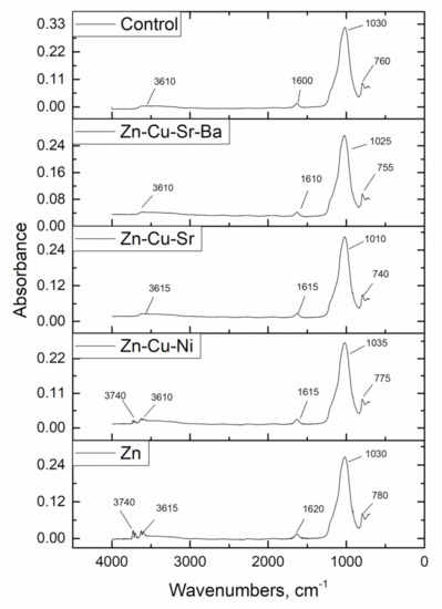 According to Figure 7, in the unloaded sorbent, the bands at 760 and 1030 cm−1 are attributed to O–Si–O and Si–O–Al groups [31]. Bands at wavenumber region 3610 cm−1 and deformation at area 1620 cm−1 could be assigned to –OH groups. The intensities of these bands were the highest in the control samples and that could be attributed to the hydrophilic nature of zeolite [32] and to –OH groups of the biofilm layer.