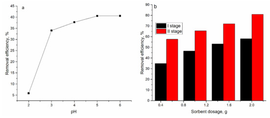 The industrial effluent analyzed in the present study contained Zn(II) in a concentration of 52.8 mg/L, while concentrations of accompanying metal ions were significantly lower, and they are not discussed. The effect of two parameters, the pH of the effluent and sorbent dosage on the mineral-organic sorbent removal capacity, was investigated. The effect of time on the efficiency of metal removal was not assessed since in our previous study it was shown that the time required to achieve equilibrium in experiments with the model solution and real wastewater was the same [33]. The necessity of the study of the effect of sorbent dosage was determined by higher Zn(II) concentration in comparison with the synthetic solution. The pH of the effluent changed from 2.0 to 6.0. As in the case of the synthetic solution, the lowest efficiency of Zn(II) removal was obtained at pH 2.0 (5.7%) and it increased to 41% at pH 6.0 (Figure 8). Thus, initial effluent pH was shown to be optimal for Zn(II) ions’ removal. The next experiment was performed at pH 6.0, varying the dosage of sorbent from 0.5 to 2.0 g. An increase of sorbent dosage leads to a rise of Zn(II) ion removal by only 18% (from 40% to 58%). Relatively low Zn(II) removal at high sorbent mass can be associated with biosorbent particle agglomeration, which decreases its specific surface area. It became apparent that multiple sorption cycles are needed to decrease the Zn(II) concentration in the effluent. Thus, a new dosage of sorbent (0.5 g) was added to effluents obtained after the first cycle of treatment.