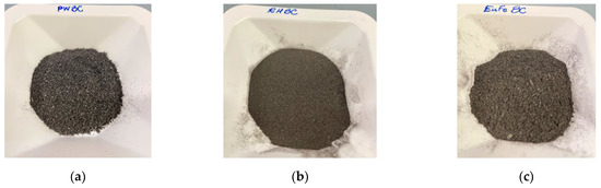 The materials were received thanks to previous collaboration between the La Sapienza University (Rome) and the University of Chemistry and Technology of Prague and the NGI (Norwegian Geotechnical Institute) of Oslo. The Pine Wood BC (PWBC) is obtained by gasifying wood at approximately 850 °C and using the resulting gases for energy recovering (wood gas generator V 3.90 Burkhardt and ECO 180 HG as heat and power plant, Plößberg bei Tirschenreuth, Germany). The technical data were extensively described elsewhere along with the composition of the resulting gas [32]. The Rice husk BC (RHBC) from rice (Oryza sativa L.) is produced with a low technology method consisting in husks pyrolysis in a little unit realized in Indonesia (kiln method). Conditions were 3.5 h pyrolysis duration and an average temperature of 300 °C [33]. In pre-treatment RHBC was sieved, so the only fraction < 125 µm was used. The third BC from Eupatorium adenophorum shrubs (EuFeBC) is obtained with Kon-Tiki flame curtain pyrolysis method, which leads back to the ancient methods of biomass combustion combined with a low gas emission. The process reaches approximatively 600 °C and powdered iron oxide-hydroxide (FeOOH) was added between fresh biomass layers. For additional details, see Silvani and Cornelissen work (2019) [34]. Since EuFeBC had a different particle size distribution, only a fraction less than 500 µm was selected and manually homogenized in a mortar. The materials for the experimental tests are shown in Figure 1.