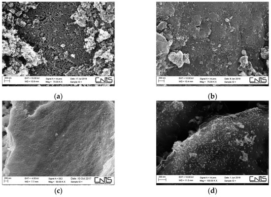 SEM images at 200 nm of resolution: (a) commercial Activated Carbon; (b) PWBC; (c) RHBC and (d) EuFeBC. Other images can be found in Supplementary Materials (Figures S1 and S2).