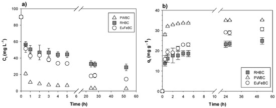 The decrease in TCE concentration over time from C0 of approximately 90.07 mg L−1 can be seen in Figure 4a. Figure 4b illustrates the amount of TCE adsorbed per gram of biochar over time. qt values have already increased after 30 min from the beginning of the test. The behavior of PWBC indicates a greater adsorbent capacity at the same contact time, compared to RHBC and EuFeBC. A greater adsorbent capacity of PWBC was calculated, with 33.6 ± 0.4 mg g−1; followed by 23.0 ± 0.83 mg g−1 for EuFeBC and 18.6 ± 1.5 mg g−1 for RHBC. 24 h were considered a sufficient time to determine the equilibrium mg TCE per gram of BC. More effective removal, based on Equation (3), was achieved by PWBC with 96.1 ± 0.4%, followed by EuFeBC and RHBC with 79.8 ± 4.2% and 63.8 ± 0.6% respectively. Rapid TCE removal and values of the mg g−1 achieved at the equilibrium time are similar with the literature, where BCs obtained at 300 °C and 700 °C (from soybean Stover and peanut shells) were compared [41]. It is also confirmed that the BCs produced at 700 °C were more effective, thus the pine wood biochar behavior is consistent with the literature. The parameters for both kinetic models are reported in Table 2. Because of the higher R2 values, PSO model works better for our kinetic data. According to some authors, a second order kinetic should represent a rate of adsorption controlled by direct interaction with solute and surface (i.e., chemisorption), as well as sharing or exchanging electron [26,41,43].