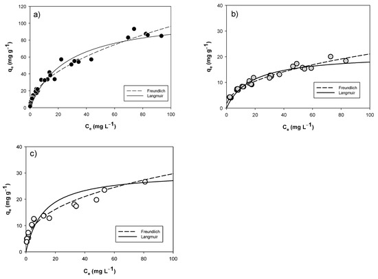 Isothermal curves (Figure 5) follow the typical trend of the adsorption of a solute onto a solid material. Within the studied concentration range (Ce), mg g−1 values increase strongly initially and then slow down as the concentration of Chlorinated Solvent increases (Ce). In particular, the tested materials do not reach an obvious plateau at the maximum of Ce investigated, confirmed by a higher R2 of Freundlich model, compared to that of Langmuir.
