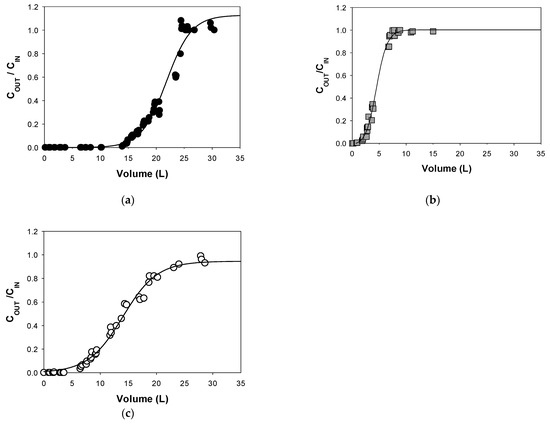 A three-parameter sigmoidal equation, Equation (8), was used to fit both tracer test data and breakthrough curves. A quantitative performance of the reactive bed has been determined. Some authors choose to define the breakthrough point once the compound can be detected in the effluent [40,44]. Alternatively, a COUT/CIN ratio can be defined in order to represent a tolerance limit (as a threshold concentration admitted by the local legislation) beyond which the effluent quality is no longer acceptable. In this case, the breakpoint was defined as the volume in which COUT/CIN = 0.05 and the bed saturation point was considered COUT/CIN = 0.95. The area between Y axis and breakthrough curve is proportional to TCE adsorbed by fixed-bed, hence the area under the curve was subtracted at the total area at the saturation point. Details on column data elaboration are presented in Supplementary Materials.