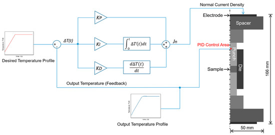 in which JE is the heat generated by the electric current per unit volume, κ is the thermal conductivity, ρ is the density and Cp is the specific heat. The heat was generated by the PID-controlled normal electric current density (Jn) on the upper surface of the electrode, and the PID regulation area was selected in the middle (height) of the upper punch. A ground condition was set on the lower surface of the electrode, while all the lateral surfaces were considered to be electrically insulated.
