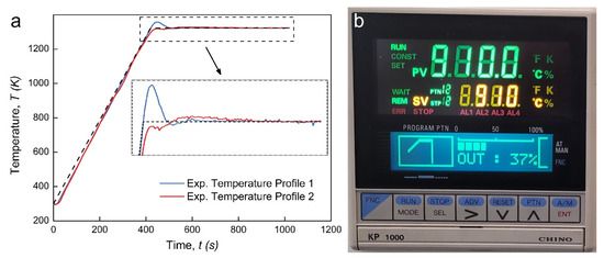 Proportional integral derivative (PID) temperature regulation in an SPS device: (a) the sintering temperature profiles and (b) the user interface of the PID temperature regulation.