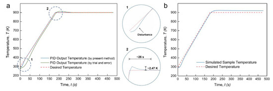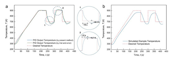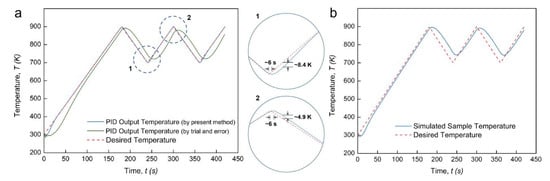 Figure 7 shows the PID-controlled regulation results for this non-continuous temperature profile. Intuitively achieving a suitable temperature regulation by using the classic PID controller is not expected, whether it is through “trial and error” or the present methods. As shown in Figure 7a, a long time delay of about 18 s and an unexpected temperature undershoot of about 39.3 K take place during the rapid cooling process. In addition, a long time delay of about 12 s and a high-temperature overshoot of about 16.7 K take place during the rapid heating process. All these deviations cannot be stabilized within a short time range. Figure 7b further shows the simulated sample temperature profile under this PID regulation condition. During the heating ramp and the thermal cycle stage, the sample temperature is far from the desired profile. It can be confirmed that the PID controller constructed by the proposed numerical method is not suitable for the regulation of non-continuous temperature profiles with sudden temperature changes. One of the possible reasons is that the PID coefficients were assumed to be continuous time functions. The main objective, in these cases, is to realize a short time delay and small overshoot or undershoot when a rapid temperature change happens. Utilization of the fraction order PID controller (FOPID or PIλDμ) could be a promising solution to this problem [26,27], as two additional adjustable parameters result in superior control performance. Beyond the scope of the present work, our future work will focus on obtaining the stable regulation of the non-continuous temperature profiles with thermally cyclic stages by using a FOPID controller.
