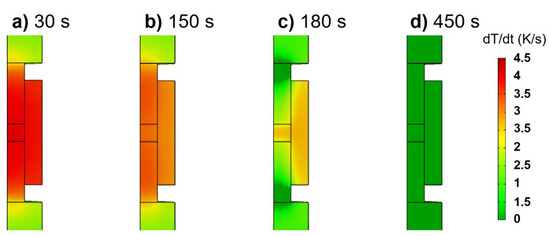 Typical heating rate fields from the punch-controlled PID regulation of regular temperature profile at different times: (a) 30 s; (b) 150 s; (c) 180 s; (d) 450 s.