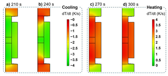 The heating rate field under the regular profile regulated by the PID controller can be revealed as follows. At the beginning, punches, die and sample all have the maximal heating rate of about 4 K/s (Figure 4a); however, the punches have a slightly higher heating rate than the sample and the die during the late stage of the heating ramp (Figure 4b). The constraint effects of the contact resistance on the flow of the electric current and heat flux flow can be more remarkable as the temperature rises, leading to the heat accumulation at the punches. When the overshoot occurs at the beginning of the dwell time, the heat responsiveness shows distinct features between punches and sample (Figure 4c). The stabilization of the temperature first starts at the upper part of the punches, whereas the sample still experiences the maximum heating rate, but it decreases to about 2.5 K/s. After stabilizing PID, the temperature regulation finishes at the end of the dwell time, and the heating rate becomes zero in all the parts of the SPS setup (Figure 4d).