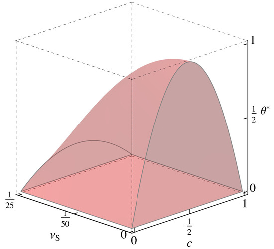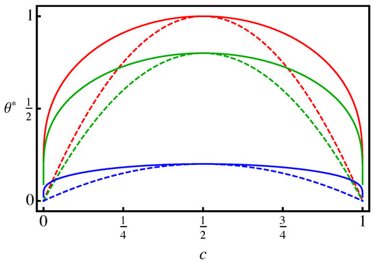 Recall that represents the so-called (here lower) critical (solid) solution or consolute temperature. In the linear chemoelastic case, diverges for except at the “critical” dilatation . Indeed, at this dilatation, the second term in (34) vanishes, and holds. Note that this dilatation corresponds to . In this case, ; (34) and (35) are then consistent. Figure 1 displays and for selected values of . At least at the critical dilatation, then, the binodal region (miscibilty gap) and its spinodal counterpart decrease with increasing solute misfit. For the spinodal region, this is also shown in Figure 2. Clearly, there is a signficant effect of elasticity, and in particular of solute misfit, on the binodal and spinodal in the context of linear chemoelasticity.