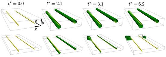 Snapshots of solute segregation to a perfect Peierls-Nabarro edge dislocation dipole for larger (above) and smaller (below) simulation cells. The cell orientation is as given in (32). Dislocation lines are shown in yellow, and the 40% solute concentration isosurface in green, and . Note that segregated solute is below (above) the left (right) monopole, corresponding to the region of positive hydrostatic stress. See text for discussion.