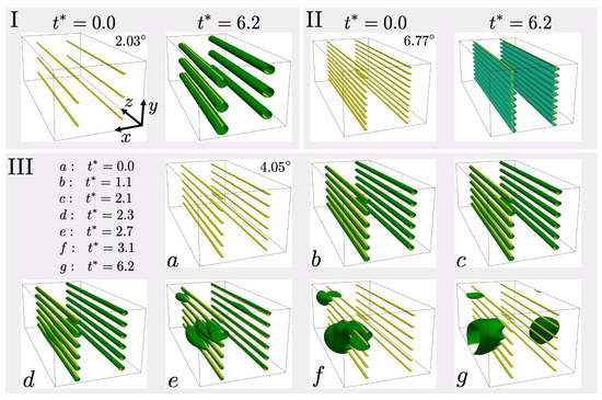 For the intermediate case (III) of tilt angle , the situation is similar to that of the single static dislocation in Figure 3 (bottom row). Indeed, increasing the number of dislocations in the system at constant system size effectively reduces the system size per dislocation. Note that the dislocation density is in (I), in (II), and 1/m in (III). Consequently, solute content limitation is again stronger, and segregation alone cannot stabilize the initially uniform solute distribution along the monopoles against spinodal decomposition. As seen starting at in Figure 4e–g, because of this, the uniform distribution along the lines becomes unstable and precipitate formation leads to solute depletion along the lines. The resulting precipitates have maximum solute concentration close to the bulk binodal (about 0.9).
