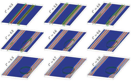 Solute segregation to, and spinodal decomposition at, an fcc edge dislocation gliding under an external shear deformation in a system/simulation cell with orientation (32). 40% solute concentration isosurface shown in green. Dislocation line visualization is based on the scalar field , which varies between zero (blue) and maximal (red) in the dislocation core. Note that the external shear deformation is applied at a rate much faster than . In addition, , and . See text for discussion.