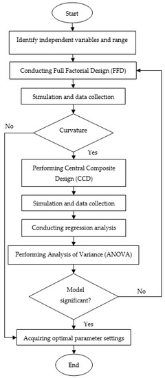 RSM was chosen as it can determine the relationships between several input variables relative to response variables. This statistical method is widely applied along with other optimisation methods to solve either single or multiple objective problems in various research areas [34]. Figure 3 illustrates the process flow of the RSM. RSM provides data to evaluate the effect of each input variable regarding shrinkage and strength in order to determine the optimal settings of the processing parameters.