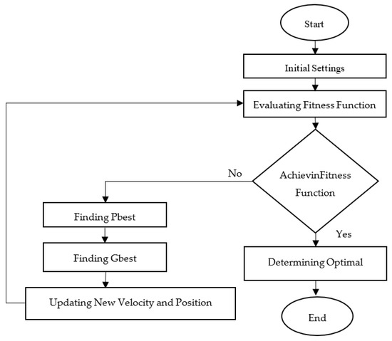 In 1995, Professor Eberhant and Dr Kennedy developed the PSO method, which was inspired by the social behaviour of flocking birds. Figure 4 shows a flowchart of PSO. The initial settings were made whereby the maximum and minimum range of the input parameters were set [41]. Additionally, the numbers of particle iterations and populations were also defined. Each time the programme evaluated a new solutions, the solution was calculated through the fitness function. The objective function gained from the RSM mathematical model was used as the fitness function to select the best solutions to produce in each iteration. In each iteration, the best solution of each particle was evaluated and recorded as , also known as the Pbest. Next, the best solution produced by particles in the population were selected and recorded as , known as the gbest. The new velocity and position of each particle were updated for the particle movement in the next iteration. The velocity and position were updated by applying Equations (1) and (2).