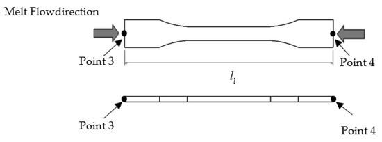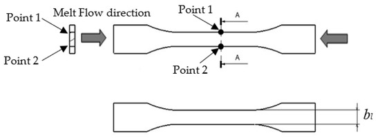 Using the same list for the setting of processing parameters in Table 4, the data of the thick plate part moulded using R30, R40 and R50 specimens were collected. The experimental tests on shrinkage of the thick plate part in the x and y directions and tensile strength using R0, R30, R40 and R50 specimens were conducted using the injection moulding machine, UTM machine (tensile test) and digital caliper (shrinkage measurement). The performance of the R30, R40 and R50 specimens were compared with that of the R0 specimen. The tests on shrinkage of the thick plate part in the x and y directions were calculated using Equations (3) and (4), at the point shown in Figure 5 and Figure 6, respectively. Information on the tensile strength of the thick plate part was acquired by using Universal Testing Machine (UTM, Shimadzu Corporation, Kyoto, Japan) with a testing speed of 50 mm/min based on ISO 527 Part 1 [42]. The shrinkage of the thick plate part in the x and y directions was measured using a digital calliper with an accuracy of 0.01 mm based on ISO 294-1 standard [43]. The measurement of the thick plate part was conducted 48 h after the parts had been injected out [17].