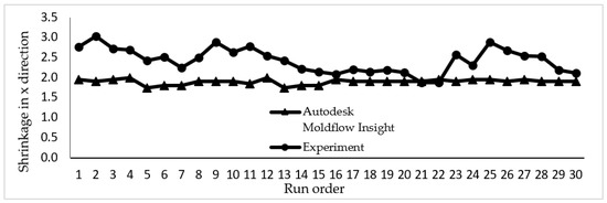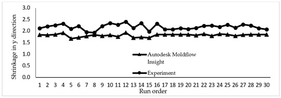 The data collected from a simulation study and experimental work for shrinkage in the x and y directions are plotted in Figure 7 and Figure 8. Both graphs showed that shrinkage percentage in the x and y directions are in a good agreement for both the simulation and experimental works. There is a slight variation as seen in the graph due to several parameters in the simulation such as mould temperature that are assumed to be constant throughout the simulation process.