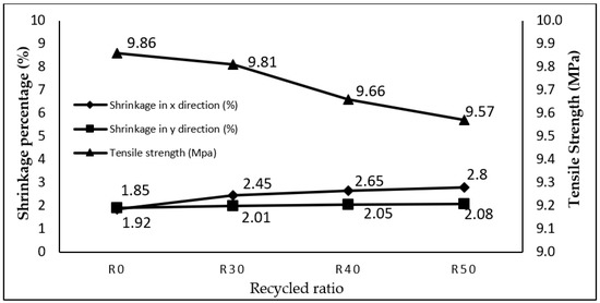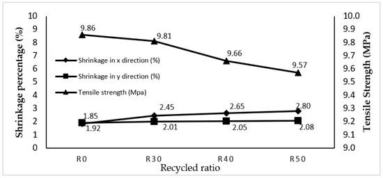 - The shrinkage in the x and y directions continues to increase when the amount of recycled ratio increases as compared to fully virgin material, while the tensile strength of the thick plate part continues to decrease when the amount of recycled ratio increases.