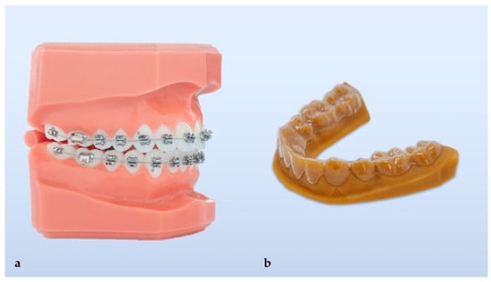 - Ryokawa, H.; Miyazaki, Y.; Fujishima, A.; Miyazaki, T.; Maki, K. The mechanical properties of dental thermoplastic materials in a simulated intraoral environment. Orthod. Waves. 2006, 65, 64–72. [Google Scholar] [CrossRef]