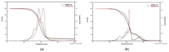 Based on the TG curves, the temperature at 5% mass loss (T5%) and residue at 800 °C (R800) were determined. The initial degradation temperature in a nitrogen atmosphere, defined as the 5% weight loss, decreased after the addition of biobased polyols to the elastomers. Oxidative degradation also showed a decrease in this temperature (Table 3); however, the values, excluding materials with SO polyol, were higher compared to the measurements carried out in nitrogen (Table 2). Despite this, the residue percentage for all materials was higher in the nitrogen atmosphere than in air. In air, the residue at 800 °C reached less than 1% of the initial mass. The only exceptions were EPUUR_TO and EPUUR for which the residues at 800 °C were 2.2% and 1.1%, respectively. In the nitrogen atmosphere, a decrease in residue at 800 °C was observed after the addition of biopolyols (Table 2). In turn, after the oxidative degradation at 800 °C, a larger char residue for EPUUR_TO was observed than for EPUR_1,5 (Table 2). The addition of TO polyol to the elastomer matrix can lead to decomposition at higher temperatures and help create char [35].