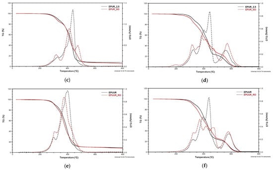 TG (weight) and DTG (derivative weight) curves of EPUR_1,5 (a), EPUUR_TO (b), EPUR_2,5 (c), EPUR_SO (d), EPUUR (e), and EPUUR_RO (f) in a nitrogen atmosphere (left side) and air (right side).