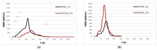 The required time to ignition (TTI) and the flame’s maintenance over the sample surface ranged from 33 to 81 s across the samples; however, no trend was observed. The most important property that determines fire risks is the heat release rate. As can be seen in Figure 2, the HRR curves consisted of more than one stage, where the first was a minor maximum, while the next one demonstrates the peak heat release rate (PHRR). The HRR curve of EPUR_1,5 (Figure 2a) was characterized by a sharp peak with a maximum value that was almost three times higher than that of EPUUR_TO. This characteristic was the result of the wood extractives, such as rosin acid, which influence the burning of materials prepared from them [36]. In turn, in the case of the EPUR_SO, the addition of SO polyol (Figure 2b) led to an increase in the HRR value, and the elastomer had an almost two times higher PHRR than EPUR_2,5. Similar to EPUR_1,5, the maximum peak of HRR for EPUUR_RO was significantly lower than for EPUUR. Consequently, the mean values of the heat release rate (av-HRR), shown in Table 4, were decreased by 64% and 74% in the cases of EPUR_1,5 and EPUUR_RO, respectively, or increased by 180% for EPUR_SO. Similar dependencies were noted for the maximum average rate of heat emission (MARHE) and PHRR/tPHRR which provides information about the possibility for fire growth and spread. The MARHEs of the reference materials were in the range of 354–407 kW/m2, while for EPUR_1,5, EPUUR_RO, and EPUR_SO, they were 170, 180, and 613 kW/m2, respectively. Even greater discrepancies were noted in the case of PHRR/tPHRR, for which the lowest value determined for EPUUR_TO was 2.3 kW/m2s, and the highest for EPUR_SO, which was as high as 23.5 kW/m2s.
