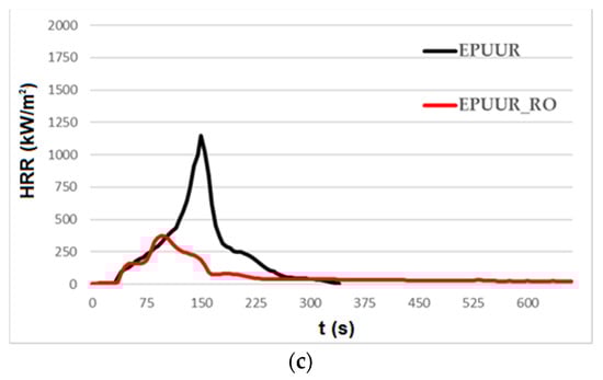 Cone calorimetry measurements are commonly applied to investigate polymers’ burning behavior. In Figure 2a–c, representative heat release rate (HRR) curves of EPURs, EPUURs, and their mixes with biobased polyols are juxtaposed and the related data are tabulated in Table 4.