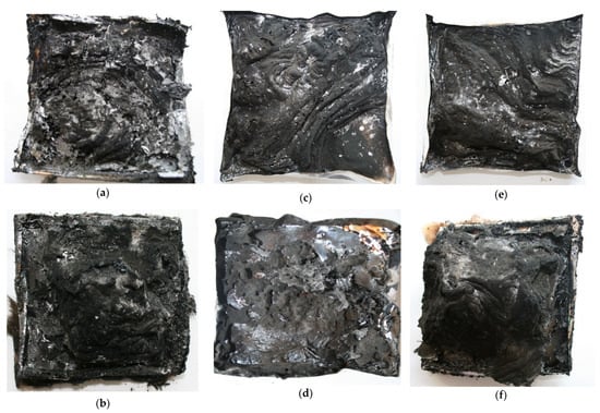 Photographs of the tested materials after the cone calorimetry test: EPUR_1,5 (a), EPUUR_TO (b), EPUR_2,5 (c), EPUR_SO (d), EPUUR (e), and EPUUR_RO (f).