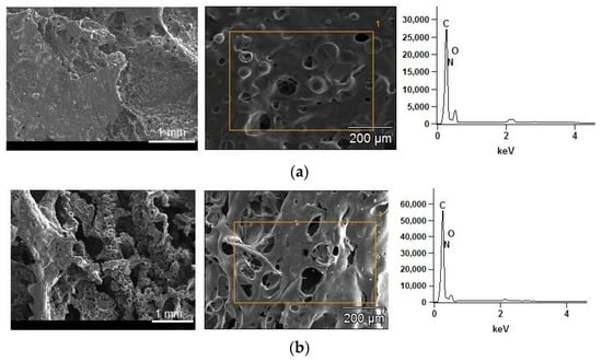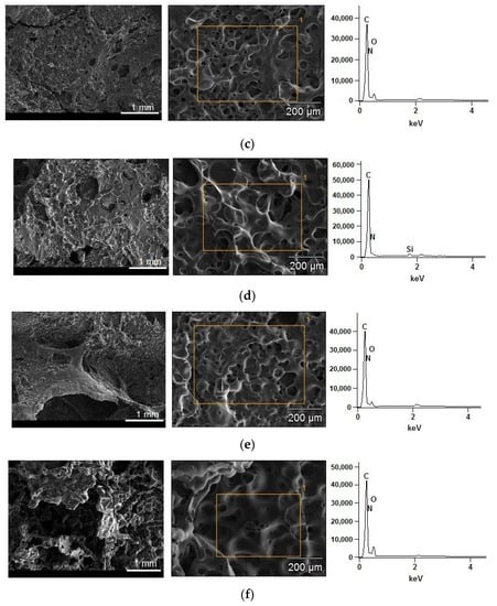 Figure 4a–f shows the SEM and EDS images with magnifications of 30× and 150×, respectively, to observe the morphologies of the char residue and analyze the elemental composition of the EPURs and EPUURs. It can be seen that the residues of elastomers containing only petrochemical polyol displayed a thin, flat in places, and broken structure because of insufficient char formation. In turn, Figure 4b,f show a three-dimensional structure, which confirmed the occurrence of intumescent char in the case of EPUUT_TO and EPURR_RO. As can be seen in Figure 4d, in the char residues, C, O, N, and Si elements were found. The addition of biobased polyols to the production of EPURs and EPUURs resulted in a higher content of C in the char residues, and the highest growth of C was found in the char of EPUUR_TO, which may have been connected with the TO polyol’s elemental composition (79% carbon, 11% oxygen, 10% hydrogen) [42]. However, due to the porous structure of the char and the different amount of material on which the beam falls, the quantitative comparison of the obtained results may not reflect the actual data. Moreover, Si was observed in EPUR_SO; this was the result of using inorganic and metal catalysts to produce the SO polyol [43].