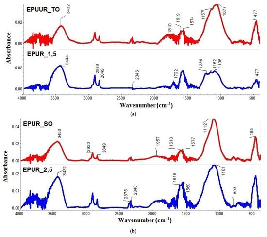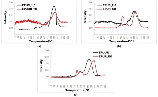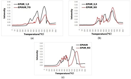 Furthermore, it was observed that the release of the carbon dioxide was decreased after the addition of TO polyol (EPUUR_TO) to the elastomer (EPUR_1,5) (Figure 9a) and it had a lower intensity than with EPUR_SO and EPUUR_RO, which was observed in the FT-IR spectra.
