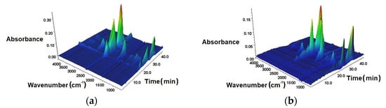 Gas-phase analyses were carried out in a TGA Q500 (TA Instruments, New Castle, DE, USA) coupled with an FT-IR Nicolet 6700 spectrometer (Thermo Fisher Scientific, Waltham, MA, USA) using 64 counts. The 15 mg samples were heated from room temperature to 860 °C with a heating rate of 20 °C/min in air with a flow rate of 90 mL/min. The FT-IR gas cell was held at 240 °C and the temperature of the transfer line was 250 °C. The spectral range of the analysis was 400–4000 cm−1 and resolution of 4 cm−1.