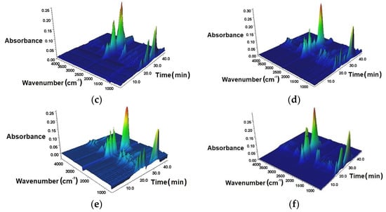 The 3D thermogravimetric analysis (TGA)/FT-IR spectra of EPUR_1,5 (a), EPUUR_TO (b), EPUR_2,5 (c), EPUR_SO (d), EPUUR (e), and EPUUR_RO (f).