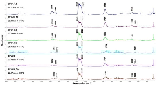 In order to study how the biobased polyols exerted the flame retardant effect of EPURs and EPUURs in the gaseous phase, a combination of the TG instrument and FT-IR spectrometer was employed to provide additional information about how the volatile products evolved during their thermal degradation, which could provide insights into understanding the flame retardant mechanisms. Figure 6a–f shows the 3D FT-IR spectra for the gases produced during the thermal degradation of the investigated samples. The FT-IR spectra of the tested materials at the maximum thermal degradation rate are shown in Figure 7. The most volatile products were released in the temperature range of 411–460 °C, which was associated with the samples’ largest loss of weight. The highest intensity for each of the EPUR_1,5, EPUR_2,5, and EPUUR occurred after 22.37 min, 23.48 min, and 22.94 min of measurement, which corresponded to maximum temperatures of 438 °C, 460 °C, and 446 °C, respectively. The introduction of biobased polyols to EPURs and EPUURs resulted in a decrease in the time down to 21.06 min for EPUR_SO, corresponding to 411 °C. The addition of TO polyol to the elastomer matrix led to an increase in the highest intensity from 22.37 min to 23.28 min, which corresponded to temperatures of 438 °C and 456 °C, respectively. For EPUR_SO and EPUUR_RO, decreases in the highest intensities of about 49 °C and 14 °C, respectively, were observed.