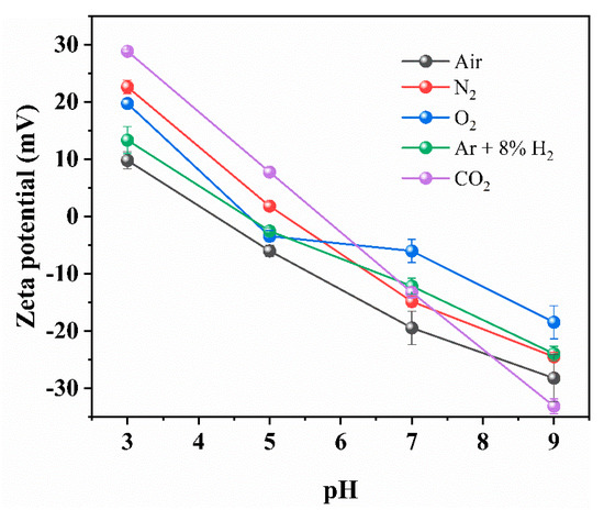 The zeta potentials of prepared different kinds of nanobubbles (N2, O2, Ar + 8%H2, air and CO2) depending on pH were measured and are plotted in Figure 2. The pH was adjusted from the natural pH by adding NaOH or HCl to achieve the desired pH. The natural pH of nanobubbles in deionized water was between a pH of 6 to 7, except for CO2 nanobubble suspensions. The zeta potential of N2, O2, Ar + 8%H2 nanobubbles were negative at about −15 to −30 mV at a natural pH of 6 to 7, while the zeta potential of CO2 nanobubbles in deionized water was positive at about +10 mV at a natural pH of 4 to 4.5. The solubility of gas, dielectric constant of gas [37] and the isoelectric point (IEP) of nanobubbles determined in this study are listed in Table 1. Since the solubility of CO2 is high (7.07 × 10−4, Table 1), the HCO3− adsorption on the CO2 bubble surface can cause a positive zeta potential in the deionized water due to the concentration of counter ions. The CO2 solubility phenomena can be explained in the following Equations (3)–(8) [38] assuming that CO2 gas is dissolved in water.