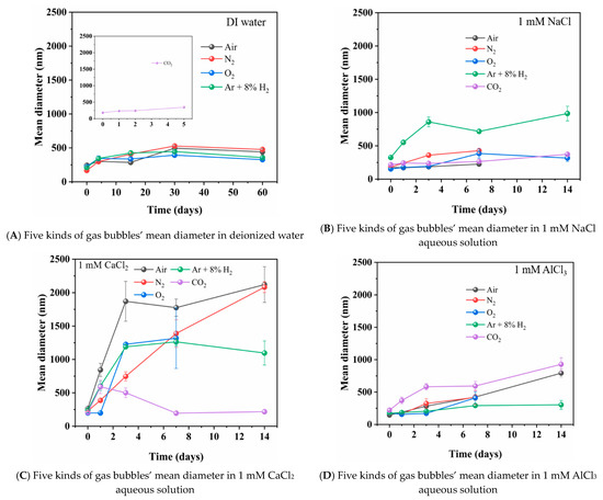 Effect of time on nanobubble mean diameter of different kind of gases (N2, O2, Ar + 8%H2 air and CO2) in (A) deionized water, (B) 1 mM NaCl aqueous solution, (C)1 mM CaCl2 aqueous solution and (D) 1 mM AlCl3 aqueous solution.