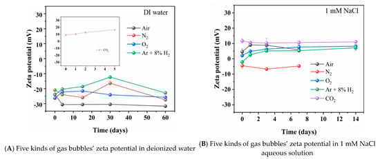 In 1 mM CaCl2 salt aqueous solution, O2 was not stable after 7 days, while N2, Ar + 8%H2 and air bubbles could be observed until 14 days, but no more were detected after 14 days (Figure 3C). The CO2 nanobubbles existed until about 20 days in 1 mM CaCl2. The absolute value of the zeta potential of N2, O2, Ar + 8%H2 and air nanobubbles was low, at less than 10 mV, while the zeta potential of CO2 was higher than +10 mV (Figure 4C). Cho et al. (2005) reported that the air nanobubble size prepared by the sonicating method was 850 nm at −8 mV zeta potential [42], and their reported results were similar to our results after one day (Figure 3C and Figure 4C). The size of the air, N2 and O2 nanobubbles in 1 mM CaCl2 salt aqueous solution increased extremely with time. Yang et al. (2001) reported that the zeta potential of the H2 nanobubble was −5.5 mV [8], and their result was similar to our result of Ar + 8%H2 nanobubble after one day (Figure 4C). For the Eh value (Figure 5C), the Eh of the 8%H2+Ar nanobubble suspension increased from 190 to 370 mV in one day, same as the nanobubbles in the other water suspensions. The Eh of N2, O2, air and CO2 nanobubble suspensions were between 400 and 450 mV and the pH of N2, O2, Ar + 8%H2 and air nanobubble suspensions were between 5.5 and 6. The pH of CO2 solution increased from 4.4, initially, to 5.3 after 7 days (Figure 5C).