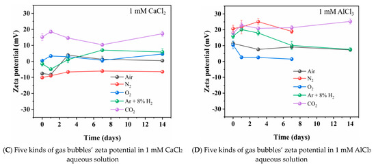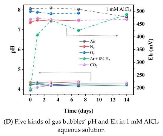 The effect of time after the preparation of the nanobubble water on the nanobubble mean diameter of N2, O2, Ar + 8%H2, air and CO2 gas in deionized water (A), 1 mM NaCl aqueous solution (B), 1 mM CaCl2 aqueous solution (C) and 1 mM AlCl3 aqueous solution (D) are shown in Figure 3. The zeta potential of the nanobubbles and the pH and Eh as a function of time are shown in Figure 4 and Figure 5, respectively. In this section, we introduce and discuss the results in the absence of salt followed by the results in the presence of salt. The Eh value change can be correlated to the H2 nanobubble concentration change, O2 nanobubble existence and CO2 nanobubble dissolution in water.
