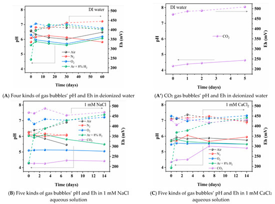 Effect of time on pH (solid line) and Eh (dashed line) of aqueous solution containing nanobubble of different kind of gases (N2, O2, Ar + 8%H2, air and CO2) in (A,A′) deionized water, (B) 1 mM NaCl aqueous solution, (C) 1 mM CaCl2 aqueous solution and (D) 1 mM AlCl3 aqueous solution.