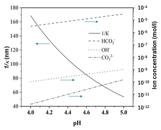 The calculated Debye lengths of the nanobubbles studied in our experiment are listed in Table 3 in order to discuss differences in the nanobubble stability and to have some idea of how to keep the nanobubble stable for a longer duration. The Debye length is 300 nm at pH 6 around N2, O2 and Ar + 8%H2 nanobubbles in deionized water, and 140 nm at pH 4.2 and 70 nm at pH 4.7 around CO2 nanobubbles. Since the characteristics of CO2 nanobubbles are different from others (Figure 3, Figure 4 and Figure 5), the Debye length (1/κ) around CO2 bubbles and HCO3−, OH−, CO32− ion concentration in the presence of CO2 nanobubbles in deionized water as a function of pH were also calculated and shown in Figure 6 in order to discuss their relationship. The concentration of various ions was calculated from using Equations (3)–(8).