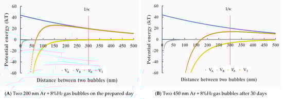 Figure 8 shows the potential energies between two nanobubbles in deionized water. Figure 8A shows the potential energies between two same-size gas bubbles of 200 nm of Ar + 8%H2 on the initial day. The total potential energy VT is 20 kT at 300 nm (the Debye length) and the maximum potential is 30 kT. The other bubbles of air, N2 and O2 bubble show almost same potential curves. It indicates that the two bubbles have enough of a potential barrier to disperse each other. Figure 8B shows the potential energies between 450 nm of two same-size bubbles of Ar + 8%H2 after 30 days. The maximum total potential energy VT is 15 kT, i.e., the threshold total potential energy to determine coagulation or dispersion [54], and it indicates that Ar + 8%H2 nanobubbles would be stable, although the absolute value of zeta potential is smallest in Ar + 8%H2 nanobubbles (−13 mV, Figure 4A) compared with the ones of other O2, N2 and air nanobubbles bubbles, shown in Figure 4.