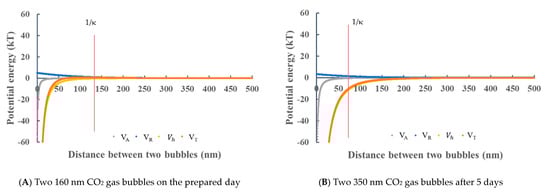 When the CO2 nanobubbles were prepared, their mean size was 160 nm and zeta potential was low, i.e., +9 mV. Figure 9A shows the potential energies between two 160 nm bubbles. The total potential barrier was not appeared at 140 nm the Debye length. Figure 9B shows the potential energies between two 350 nm bubbles after 5 days. As the total potential barrier was also not appeared, these larger bubbles would also coagulate, coalesce and increase the size and, thus, CO2 bubbles could not be observed after 5 days.