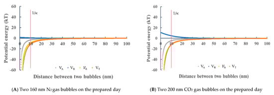 In the 1 mM NaCl aqueous solution, the absolute values of the zeta potential of O2, N2, Ar + 8%H2 and air nanobubbles were less than 10 mV; the total potential energy barrier could not appear. Figure 10A shows the potential energies between two 160 nm N2 nanobubbles. The total potential energy VT is negative at any distance and does not show the potential barrier; therefore, the nanobubbles are not stable and can coagulate. Figure 10B shows the potential energies between two 200 nm CO2 nanobubbles. Although the absolute zeta potential was slightly larger than the sN2 nanobubbles at the Debye length 10 nm, there is no potential barrier indicating the attraction between the two bubbles. The CO2 nanobubble size existed between 200 and 400 nm for 14 days, as shown in Figure 3B; however, after 14 days, the CO2 bubble was disappeared.