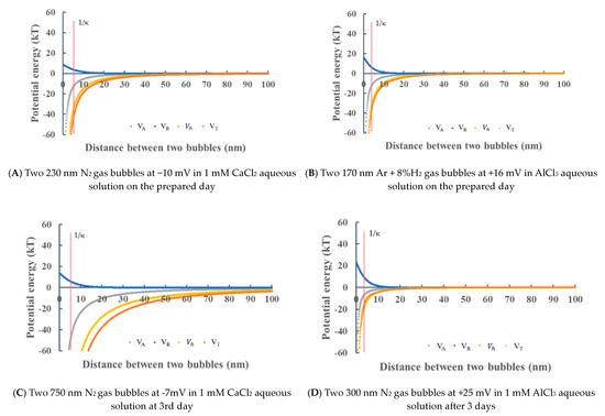 In the 1 mM AlCl3 aqueous solution, Figure 11B shows the potential energy between two 170 nm Ar + 8%H2 nanobubbles on the prepared day. Although the absolute value of the zeta potential was higher (+16 mV, Figure 4D) than the one of Ar + 8%H2 nanobubbles prepared in a CaCl2 aqueous solution (−2 mV, Figure 4C), there was no potential barrier due to the small electrostatic interaction potential (<15 kT) and the bubbles may be unstable. In Figure 11D, with the N2 nanobubble size of 300 nm and the higher zeta potential (+25 mV, Figure 4D), the potential barrier was not also appeared.